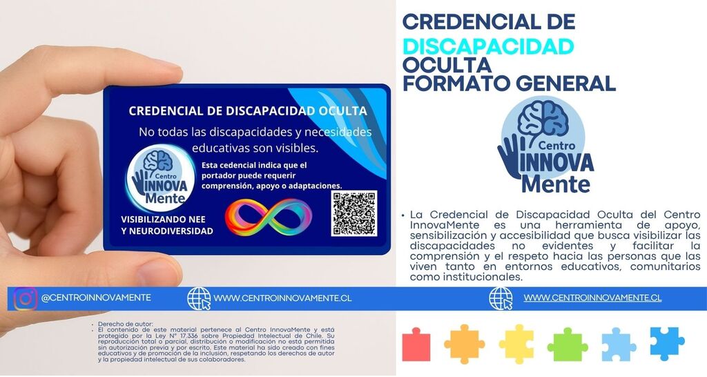 La Credencial de Discapacidad Oculta en formato personalizado es una herramienta creada por el Centro y Fundación InnovaMente para acompañar a personas neurodivergentes o con necesidades educativas especiales cuya condición no es visible a simple vista.