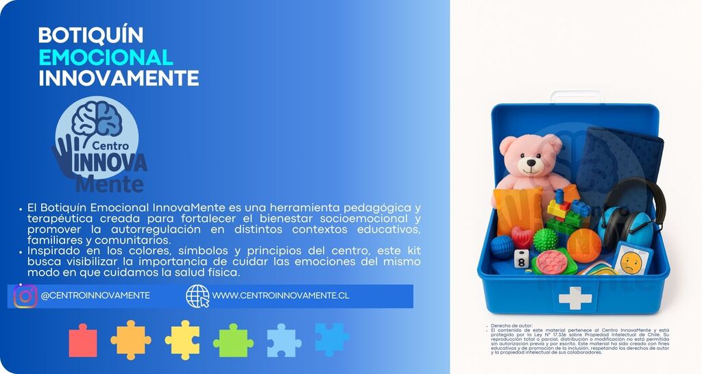 El Botiquín Emocional es una herramienta psicoeducativa diseñada por el Centro y Fundación InnovaMente para fortalecer el bienestar emocional y la autorregulación de niñas, niños y jóvenes. Su objetivo es entregar recursos concretos que permitan identificar emociones, expresar lo que sienten y desarrollar estrategias de calma en contextos escolares, familiares y comunitarios.